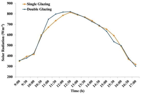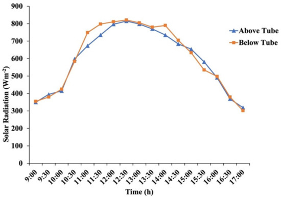 The experiment was performed in a cold climate after establishing steady-state conditions with varying solar intensities on different days and with variations in ambient temperatures. The data recordings for solar intensity were carried out at 30 min intervals for the two cases, which were almost the same as observed in Figure 5.