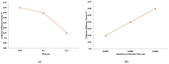 The thickness of the absorber plate and pitch W (center-to-center distance of tubes) were mathematically computed for economical optimization of the experiment, as a low value of W will result in an increased length and a higher δ value will increase the material cost. Additionally, the F′ value was observed to be strongly influenced by W and δ in Figure 6a,b, as F′ increased with an increase in the thickness of the absorber plate and correspondingly decreased with an increase in the W value; therefore, the optimal pitch and thickness for absorber plate for the experiment were 0.1 and 0.003 m, respectively.