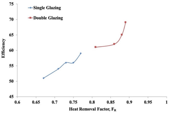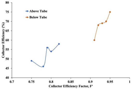 The effect of the efficiency of the collector (η) on the F′ (Figure 7) resembled the prominence of the collector tube arrangement, i.e., when placed below the absorber plate, η values ranged from 46% to 58%, with variations in F′ ranging between 0.75 and 0.83, while η values ranged from 60% to 75% when the tubes were placed above the absorber plate, with varying F′ values ranging from 0.91 to 0.95.