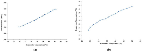 Figure 8b shows the effects of the evaporator temperature on the condenser temperature, showing that with the increases in evaporator temperature, the working fluid condensing temperature also increased. Nevertheless, the effects of the solar radiation on the evaporator temperature were greater than that of the condenser temperature. When solar radiation started decreasing, the evaporator temperature decreased irrespective of the condensing temperature, showing that at a higher temperature, evaporation takes place in the system, which in turn improves the performance of the system.