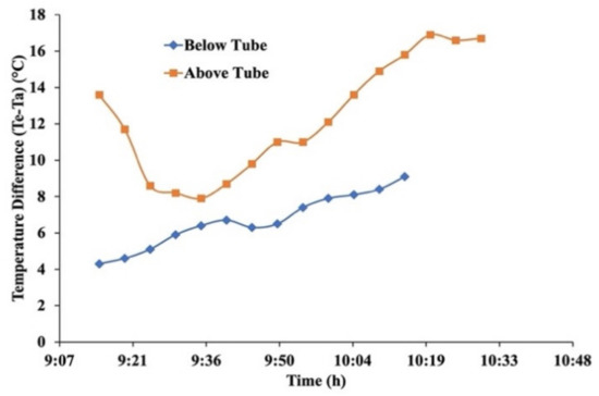 The evaporator temperature is not allowed to exceed a certain value, as the compressor may get damaged when pushed beyond its operating limits. In the case of the below tube arrangement, the evaporation temperature may have been equal to ambient temperature; hence, better performance for the SAHPSWH was achieved as compared to the above tube arrangement shown in Figure 9.