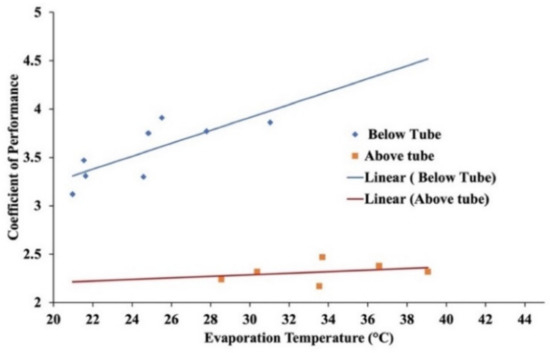 An increase in COP with the increasing evaporation temperature due to its higher heat transfer rate than condenser can be observed in Figure 10. The relations between the collector efficiency factor (F′) and collector efficiency (η) for different sheet and tube arrangements are presented in Table 3, which shows that the efficiency of the below tube arrangement was better than the above tube evaporator arrangement.