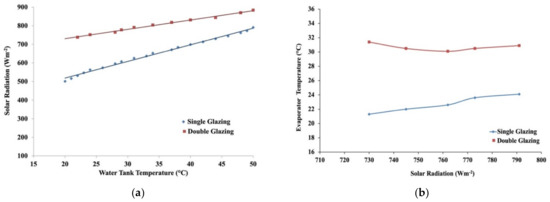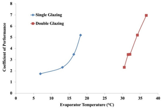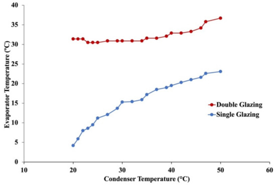 Figure 12 presents the increases in storage tank temperature with increasing evaporation temperature. With a limited compressor capacity temperature, the evaporator is not allowed to exceed a certain limit. According to the performance characteristic analysis for the single-glazed evaporator, the evaporation temperature could not surpass 23.1 °C, which is near ambient temperature; however, for the double-glazed evaporator, it exceeded the ambient temperature of 36.7 °C, achieving better performance for the heat pump.