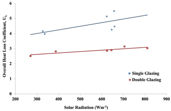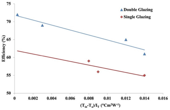 - The collector efficiency is strongly influenced by the parameter (Ti–Ta)/IT; if this parameter increases then collector efficiency decreases, because the slope of this line – (FR UL) represents the rate of heat loss from the collector. This slope decreased as the number of glazing layers increased from zero to three.