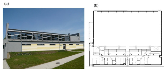 Passive hall in Słomniki, south façade (a) (author’s archive), and ground floor plan (b) [23].