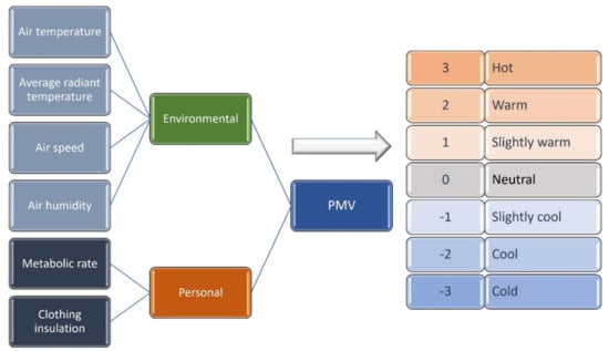 Parameters used in the predicted mean vote (PMV) calculation and relation to thermal sensation scale.