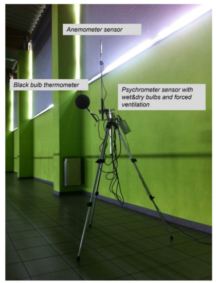The location of the measuring device on the mezzanine floor was dictated by the safety of the meter and the possibilities resulting from the way the facility is used. The location of the sensors could not interfere with the schedule of the sports activities taking place. It was verified that the difference in height between the level of the hall floor in Słomniki, where the classes occurred, and the location of the device could have some small effect (±0.5 °C) on the final results of the analyses. However, this was the only possibility to conduct measurements during the normal operation of this facility.