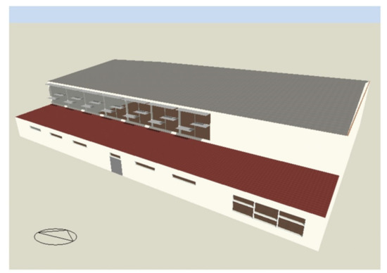 A model of the entire sports arena building, Figure 4, was created in DesignBuilder; however, the simulation analyses focused on the arena itself and the active occupants. In the model, the parameters, structures, and installations of the object were taken into account, as well as the schedules of people present. Due to the nature and purpose of the analyzed facility, the metabolic activity called “exercise/sport”, available in the program library database, was chosen. This value gives the volume of the heat flux produced by the human body, and in the assumed case, it is 300 W/person [26,32]. The value of the athlete’s metabolic rate assumed for the simulation reflects the activity observed during the measurements. It should be kept in mind that the analyzed hall is a place for practicing different sports with different activity and associated metabolic intensity (200–464 W/m2) [33]. A clo coefficient value of 0.4 was assumed for the users of the analyzed hall practicing sports in light clothing.