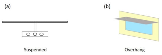 Due to the lack of precise information in the design documentation, the required illuminance was based on the standard [34] equal to 400 lux. Suspended lighting was assumed for modeling the hall (Figure 5a), selecting the “Best practice” suggested option with the most favorable parameters from the DesignBuilder library. Lighting characteristics: