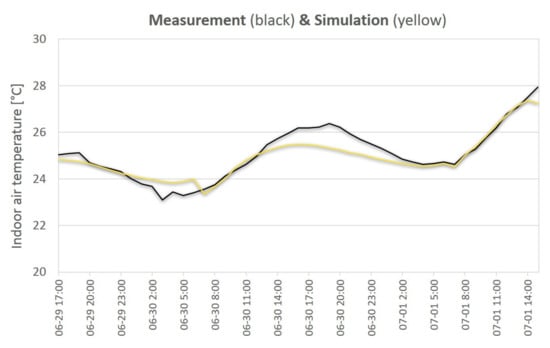 The created simulation model was validated. For this purpose, weather data were obtained from IMGW (Institute of Meteorology and Water Management) in Cracow, which is the meteorological station closest to Słomniki, located approximately 24 km away toward the north. Looking for the degree of dependence between the results obtained by measurements and simulations, first of all, the correlation coefficient was calculated, taking values in the range [−1,1]. Comparing the results of indoor air temperature measurements during the summer 29.06.–01.07. with the results of the model obtained by simulation for the same period, the value of the correlation coefficient equal to 0.94 was obtained (Figure 6).