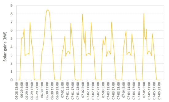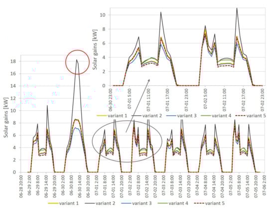 The solar radiation intensity values considered in the analysis were determined based on data from the Institute of Meteorology and Water Management IMGW and literature. In summer, the typical range of variation in the intensity of radiation on the horizontal plane is from 100 to 800 W/m2 [40]. The range of values 100–400 W/m2 was analyzed, and the corresponding hours during the summer analysis period were examined. It was found that the protection against excessive gains makes sense only from the early morning hours, so in the detailed simulations, the threshold values of 100 W/m2 (already present at around 4 a.m.) and 200 W/m2 (around 6 a.m.) were kept.