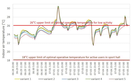 The distribution of the indoor air temperature for the chosen week is presented in Figure 14. Generally, it should be stated that making the shading control dependent on the ambient conditions did not obtain the expected significant improvement of the conditions in the hall. Individual variants also differ little from each other. The momentary differences in the obtained results are very small and amount to a maximum of 0.7 °C.