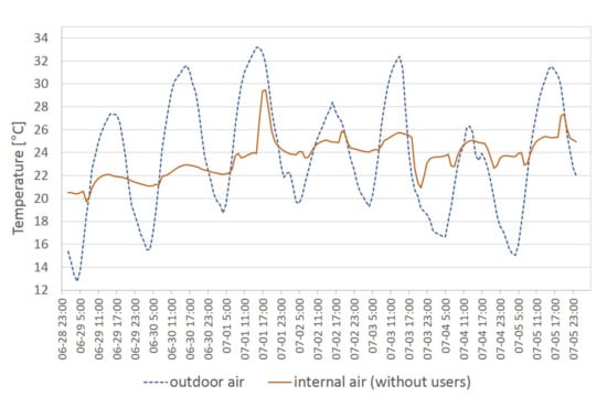 It should also be added that mechanical ventilation was designed in the examined building, whose task was to provide fresh air at the required and controlled level, regardless of external conditions. In practice, it could be concluded that the way the examined building was actually used was far from the design assumptions. During the measurements, the available mechanical ventilation was not used, which have influenced the obtained results of measurements and simulations. An effective measure to reduce overheating of passive buildings is also night ventilation. In the hall in Słomniki, an attempt was made to reduce excess energy by opening windows in the early morning and evening, but this was not sufficient to cool such a large volume of the building. Night ventilation was not implemented due to the risk of burglary. The conducted separate analyses about the influence of ventilation on thermal comfort show that the predicted mean value in option without night ventilation is 0.2–0.7 higher compared to the option with night cooling. Intensive natural ventilation makes it possible to lower the maximum temperature at night by 4 K, compared to the variant without night ventilation. In the case of natural ventilation by night, indoor air temperatures are lower by 0.4–1.7 K during the day compared to the option with mechanical ventilation by night. The effects of night mechanical ventilation of a large-volume hall are weaker compared to natural night ventilation. This is due to the relatively low mechanical power of ventilation in relation to the entire volume of the interior. Mechanical ventilation intensity was related to the expected number of users, not the volume of the interior. The maximum ventilation capacity is 9000 m3/h, which corresponds to the volume air exchange rate of 0.9 h−1. Night natural ventilation is more effective in removing excessive energy gains in the analyzed building due to the average number of air changes at the level of approximately 2–4 h−1. Analyses of the impact of nighttime cooling on the thermal capacity of the building by intensive ventilation are also the subject of separately published articles [1,41].