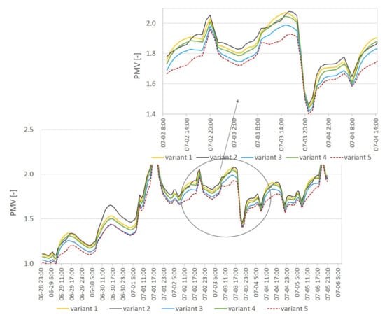 The number of hours for which conditions fall within the thermal comfort range for variant 2 and variant 1 is the same, at only 4 h. Only the number of hours with PMV > 2.0 (Table 6) differs slightly for each variant. Even in the most favorable option, i.e., variant 5, in which the number of hours falling within the range −0.5 < PMV < +0.5 is the highest (24 h), it constitutes only 3.2% of all 744 h in a month. Therefore, it can be concluded that in the best variant, only one day in a month is fully comfortable, and during the other days, the users experience strong discomfort due to overheating of the building.
