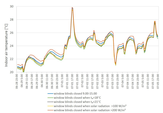 The variant, in which closing the blinds was conditioned by the maximum value of solar radiation intensity equal to 200 W/m2, is the least favorable for the analyzed summer period and generates the highest temperatures in the hall (orange graph Figure 14). Two out of the five applied variants practically overlay in weekly distribution. The yellow graph (irradiance > 100 W/m2) and the gray dashed graph (ta > 21 °C) do not show significant mutual differences in the course of the temperature in the hall but are more favorable in relation to the initial variant. The blue graph, reflecting the actually applied shading schedule from 9 a.m. to 3 p.m., is not, as can be seen in Figure 13, the best solution for limiting direct radiation. The lowest temperatures are observed in variant 2 (green graph) when the blinds are closed at ta >18 °C. It is worth noting again, however, that the differences in internal temperature values between all the variants are negligible and not perceptible for the hall user.