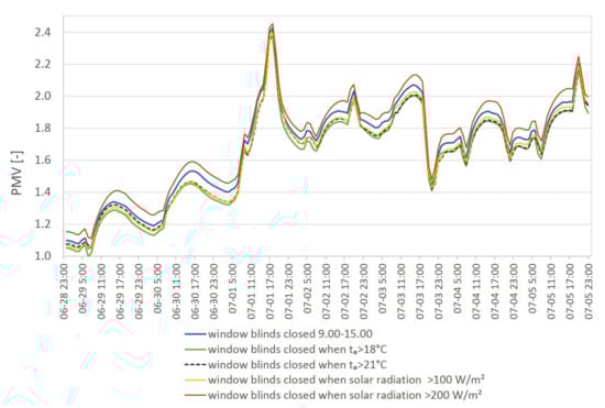 The lowest values of PMV are found for variant 5 (dashed red graph), the highest for variant 2 (gray graph). The difference in PMV values for the extreme variants is about 0.2. The use of brise-soleils and the location of the blinds on the outside, and the complete reduction in solar transmittance proved to be the most effective. As with temperature, modifying the characteristics of the blinds in variant 4 did not significantly increase the number of hours of thermal comfort.