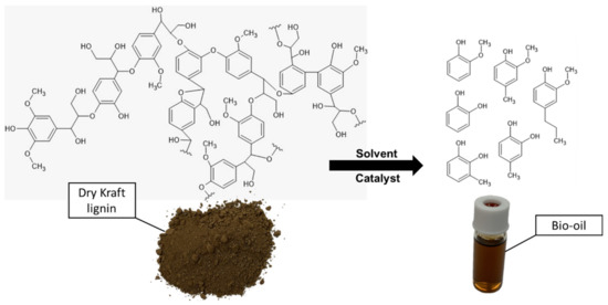 Depolymerization of Kraft lignin to produce bio-oil has been extensively studied in the past decades, and various methods have shown excellent results [25]. This depolymerization process is shown in Figure 1, where the chemical bonds of lignin are severed, usually in presence of a catalyst and a solvent at relatively high temperatures.