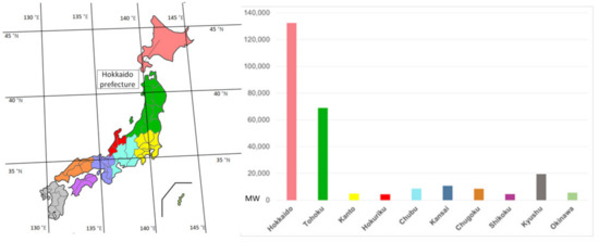 Hokkaido, the northernmost island of Japan, is sparsely populated, yet holds the highest onshore wind power potential among all prefectures of Japan, followed by Tohoku and Kyushu, as illustrated in Figure 2.