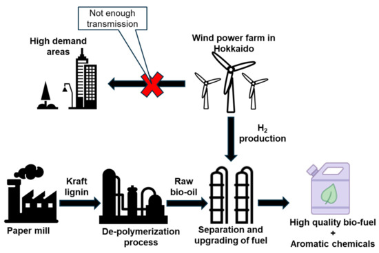 The scenario described below points to the possibility of using Kraft lignin from paper pulp mills in Hokkaido as a year-round source of biomass that can be reliably transformed to bio-oil that is then upgraded with wind-power-derived hydrogen, allowing for the constant production of a high-quality hydrocarbon mixture and aromatic chemicals.