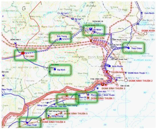 There are also overload issues with the 220 kV lines in areas with many RESs in the South-Central Coast region like Ninh Thuan and Binh Thuan provinces (e.g., the 220 kV Da Nhim—Duc Trong—Di Linh, DMZ, the 220 kV thermal power station Hong Phong 1—Phan Thiet, the 220 kV transmission line Quy Nhon—Tuy Hoa, the 220 kV transmission line Phu My—Quang Ngai, the 220 kV transmission line Quang Ngai—Doc Soi and the 500 kV transformer Dak Nong). If all of the current RESs are at maximum capacity, the grid will be severely overloaded, with overload rate from 105% to 140% [16]. The increase in proportion to RES sources causes new difficulties and challenges in the power system. Figure 1 illustrates part of the 220 kV and 500 kV transmission system in two provinces of Ninh Thuan and Binh Thuan.