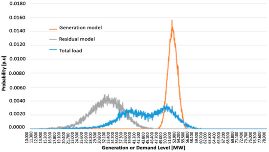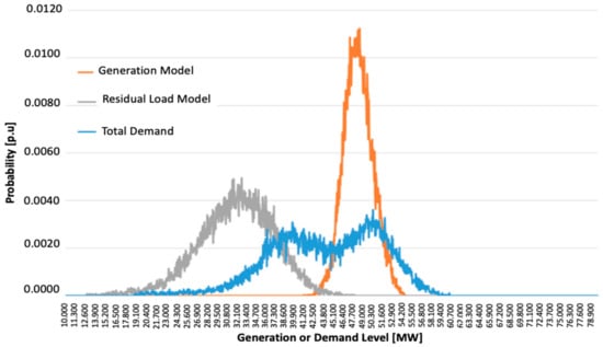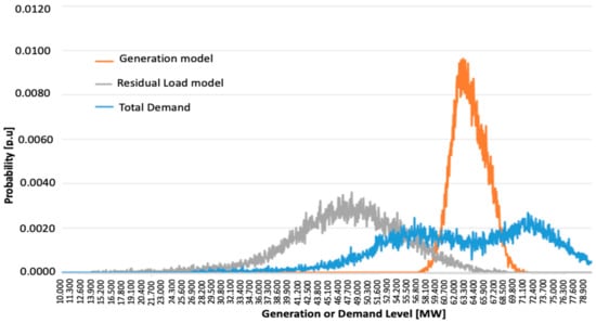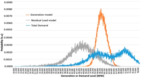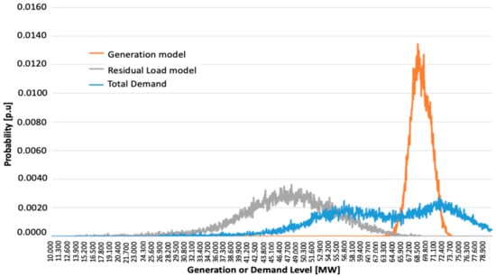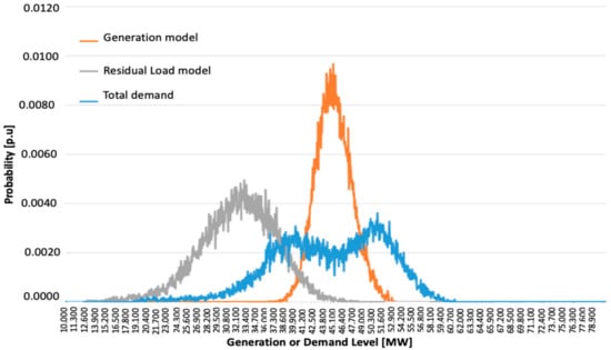 Residual load, total load and available thermal generation in 2030—probability density function.