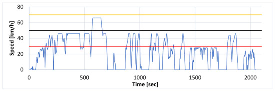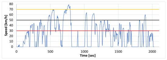 Other parameters, interesting from the point of view of the vehicle’s energy consumption, are listed in Table 4. Green indicates the highest values and yellow the lowest ones. The data from the “summer” mode have been shown in gray for comparison. The analysis of data from this driving mode allows to assess to what extent the air conditioning system and the lack of interference of the internal combustion engine with the power supply of the drive system affect the energy consumption of PHEV 4 × 4 SUV vehicles. The fuel consumption for the internal combustion engine in the “summer” mode is marked in red. When analyzing trip parameters, it can be noted that the average speed was between 24.3 km/h and 26.5 km/h and that the maximum value of 78 km/h was reached while driving in the “normal” mode. The lowest speed value of 66 km/h was recorded for a run with “rules”. Speed profiles for both cases are shown as test runs in Figure 1 and Figure 2. The speed fluctuations during the “normal” and “rules” driving modes can be seen in the speed profile diagrams provided. They show the sections of the route where speed limits to 30, 50 and 70 km/h have been made. Both figures also show three lines corresponding to the individual limit values. In the “eco” and “summer” modes, the distribution of the driving speed profiles was very similar to the “normal” and “rules” modes. It is caused by driving on the same route with the same restrictions, e.g., traffic volume, number of lights, number of additional territorial obstacles.