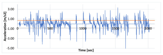 Acceleration values over the measured section were between 0.65 and 0.75 m/s2. Braking during the test was between −0.72 and −0.83 m/s2, the most frequently encountered in urban traffic [34]. Speed and acceleration values are consistent with those obtained by other researchers when analyzing vehicle behavior in urban traffic [35,36]. An example of acceleration values recorded during one of the tests is shown in Figure 3.