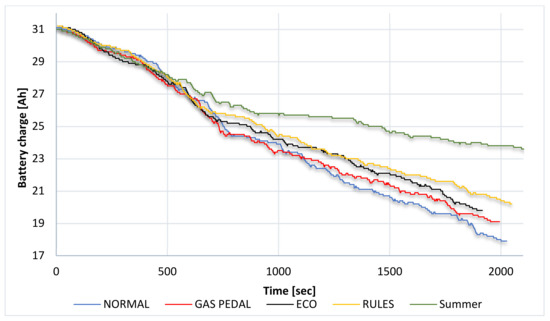 While examining the range of electric vehicles, an important parameter is the loss of the battery’s capacity after travelling over a certain distance. In the tests, the loss was between 10.8 Ah and 12.9 Ah. The decrease in battery capacity is shown in the example of Figure 4. During the runs, a part of the capacity was also recovered, and depending on the driving technique applied, it was between 1.2 Ah and 2.2 Ah. The lowest value of the consumed battery capacity was obtained for the “summer” mode. It was 7.9 Ah. In this mode, the recovery of electricity was similar to the “eco” mode and amounted to 1.5 Ah. Based on the road tests carried out, it can be concluded that the most effective energy recovery is represented by the “pedal gas” mode. Nevertheless, it did not guarantee the best results in terms of battery capacity loss, intensity of the braking process and fuel consumption by the internal combustion engine. Fuel consumption is the highest for the “normal” and “pedal gas” modes. Based on the obtained data, zero chemical energy consumption from fuel was obtained in the “summer” mode. For this mode, the lowest value of the average energy consumption during the test is also recorded. The value of this parameter is 18.0 kWh/100 km. Positive results were also obtained for the drive in the “summer” mode and the “rules” mode. The average value of energy consumption over time for this mode does not exceed 24.0 kWh/100 km. The above parameters show the ability to generate reusable energy. The average power recovered during regenerative braking was between 6.3 kW for driving in accordance with the regulations and 8.5 kW for the “normal” driving technique. The most appealing parameter and, at the same time, a measurable indicator for the use of a particular driving technique is the average energy consumption per 100 km. During the tests, the consumption varied from 24 kW/100 km to 28 kW/100 km. Based on the road tests carried out, it can be concluded that the average recuperative braking power is the highest for the “normal” mode. It amounts to 8.5 kW. For “rules” and “summer” modes, the average recuperative braking power ranged from 6.2 to 6.3 kW. The other modes are within the accepted range of maximum and minimum values. In connection with the adopted data, it can be concluded that the average power of regenerative braking does not always indicate energy gains and an increase in range. This is due to the fact that the greatest range was obtained for the “summer” and “rules” modes, despite the lowest braking energy recovery value.