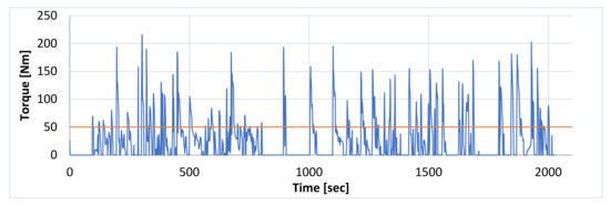 The observation of the powertrain during the test runs shows differences between the different driving techniques. The differences reach 20% between the extreme torque values generated by both engines in “normal” and “eco” drive modes, respectively, 51.9 Nm and 41.4 Nm. When braking with electric motors, braking torques were from −31.8 Nm (“Eco”) to 40.4 Nm (“pedal gas”). Examples of characteristics are shown in Figure 5 and Figure 6. For the “summer” mode, the results of the average driving torque were similar to the “rules” and “eco” modes.