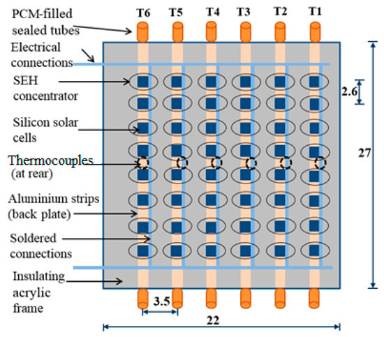 Schematic of the WICPV system with PCM-filled copper tubes (all dimensions in mm); adapted from [26].