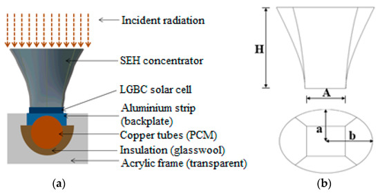 (a) Cross-sectional view of the designed system and (b) design of the SEH concentrator with specific dimensions of H = 30 mm, A = 10 mm, a = 24 mm, b = 33 mm; adapted from [26].