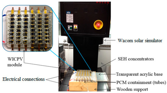 A WICPV system with up to 50% transparency and six times theoretical geometrical concentration ratio is fabricated using Square Elliptical Hyperboloid (SEH) concentrators. These concentrating elements are used on top of silicon solar cells (10 mm × 10 mm) glued on narrow aluminium strips, allowing effective heat transfer. Copper tubes with two paraffin-wax-based PCMs (RT28HC and RT50) and circulating water (at a rate of 5 mL·s−1) are tested. The thermal management effects on the system performance improvement in terms of both the maximum electrical power output and the reduction in operating temperatures are studied. The experiments are conducted indoors under a solar simulator, providing continuous irradiance of 1000 Wm−2. The results obtained from the experimental runs and the conclusive arguments are outlined as: