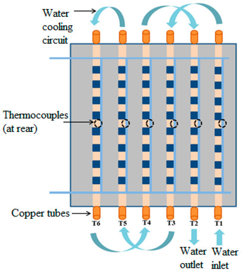 All six K-type thermocouples calibrated using ice and steam are used to record temperatures at the centre of each solar cell strip under the aluminium strip (Figure 1 and Figure 4). All experiments are carried out indoors under ambient temperature conditions between 27 and 29 °C with a relative humidity between 37% and 46%. For the experimental run with water, an arbitrary flow rate of 5 mL·s−1 is selected, a rate at which the flow is visibly streamlined. Below this rate, the pipe flow remains constricted, and higher rates produce more turbulence due to a high Reynolds number. The water circuit for circulating water is illustrated in Figure 4. Five clear soft plastic tubes on either side of the copper tubes are used as conduits for interchannel flow. For these experiments, the difference in heads of water supply and the WICPV system acted as the driving force for the water flow, doing away with the need for an electrical motor or pump and saving active power losses. Hence, it may be argued that although water continuously circulates (without recycling) in this experimental setup, it still passes as a passive cooling mechanism.
