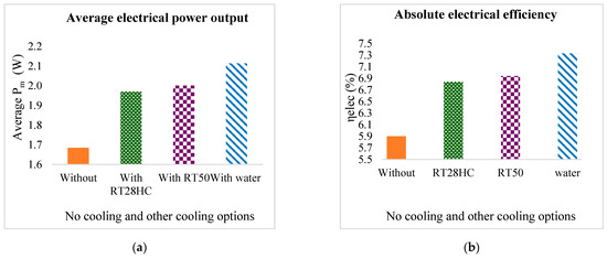 As observed, the maximum output power is generated with circulated (but not re-used) water cooling (7.8% increase in Isc, 5.4% in Voc), followed by using RT50 (12.4% increase in Isc, 2.7% in Voc) and RT28HC (12% increase in Isc, 1.8% in Voc), against the naturally ventilated system. The curves obtained from the I-V tracer and the measured data show a 16.9% output electrical power improvement with the use of RT28HC, 18.7% with RT50, and 25.5% with circulating water at 1000 Wm−2, as compared with the naturally ventilated setup. A relative percent increase in electrical efficiency of 15.9% is achieved with PCM RT28HC, 17.6% with RT50, and 24.2% with circulated water. The average Pm for the WICPV with the three implemented cooling options and the natural convection cooled system is given in Figure 5a. The average electrical power output with no applied cooling is 1.70 W with PCM RT28HC, 1.97 W with RT50, and 2.00 W, while with the circulating water cooling, it reaches 2.11 W. The absolute electrical efficiency of the WICPV without additional cooling and with latent and sensible cooling is illustrated in Figure 5b.