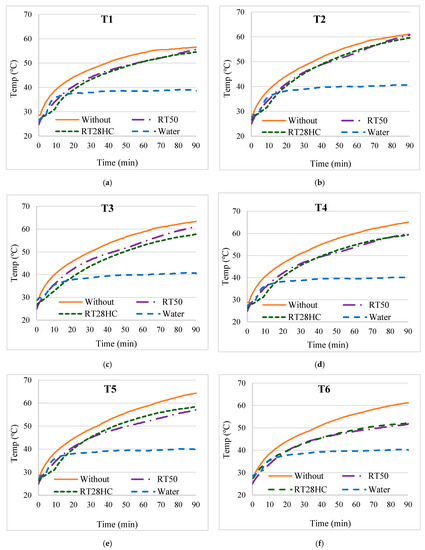 The temperatures at the end of the run, after 90 min, attained by channels T1 to T6 with PCMs RT28HC and RT50 and water are tabulated in Table 5. As deduced from these data, both the low-melting PCM RT28HC and the high-melting PCM RT50 would reach the molten state. Having undergone complete phase transformations, the end temperatures are well above the melting peak for the PCMs, 28 and 49 °C, respectively.