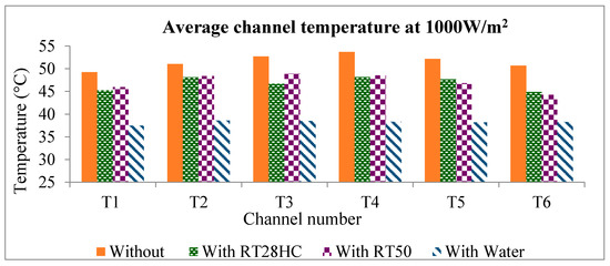 As the water is continuously circulated freshly without recycling, despite lower heat capacity, it is still able to achieve higher benefits. The highest temperature attained within the WICPV system without PCM is 53.7 °C, while it is 48.2 °C with RT28HC, 48.9 °C with RT50, and 38.6 °C with water. Similarly, the lowest average temperatures are recorded as 49.2, 44.9, 44.2, and 37.5 °C for the respective cases (more details in Table 4). There is an insignificant (less than a degree) variation between the highest and lowest average temperatures when using both the PCMs. It can also be seen that average temperatures across all channels with water as a cooling medium is almost constant with a variation of ±0.4 °C. Exceptionally, T1 (inlet water channel) experiences the lowest average temperature (37.5 °C) compared with the highest (38.6 °C) within T2 (outlet channel) due to the water circuit configuration. For the two cases of PCM cooling, the temperature at the central channels (T3 and T4) are comparatively higher. This is due to their central location achieving lesser cooling via natural convection otherwise available to the channels on the sides or edges, such as T1.