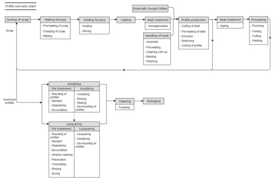 Figure 3 shows the production processes used at profile extrusion plants. The profiles can be either anodised or lacquered. However, lacquered profiles can sometimes be anodised prior to lacquering, which is indicated by the dotted arrow from anodising to lacquering in the figure. There are several different pre-treatment processes that can be used prior to lacquering. However, not all of these are used in every case, and the processes that are chosen depend on what the customer wants. Haraldsson and Johansson [