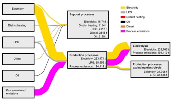 Figure 7 show the energy end-use and GHG emissions, respectively, of the aluminium industry and two aluminium casting foundries in Sweden, divided into support and production processes. The energy use and GHG emissions for electrolysis are also shown in the figures, and they will be excluded in the subsequent figures dealing with the energy balance and GHG emissions to make these figures clearer.