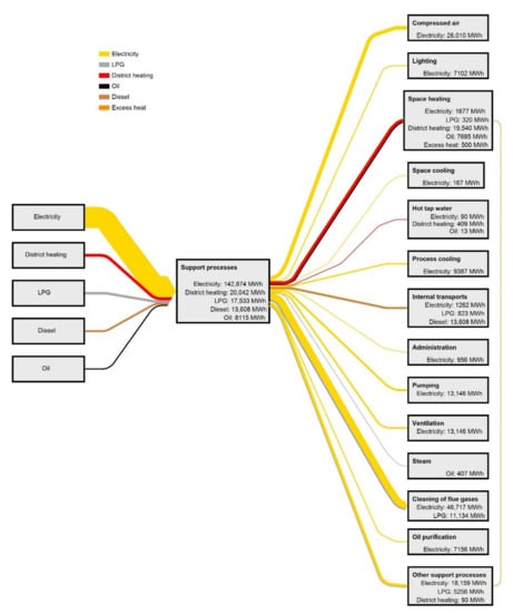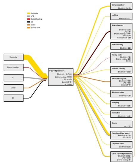 Figure 9 show the energy end-use and GHG emissions, respectively, of the aluminium industry and two aluminium casting foundries in Sweden regarding support processes. The entry “other support processes” includes values for “other processes” found in the companies’ energy audits (both values purely for support processes and combined values for support processes and production processes), values covering several support processes, and values for support processes that were considered too specific for a company (i.e., a process that probably does not exist at other companies with similar production).