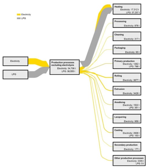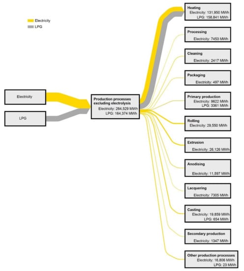 Figure 11 show the energy end-use and GHG emissions, respectively, of the aluminium industry and two aluminium casting foundries in Sweden regarding production processes divided into each main category. The entry “other production processes” includes values for “other production processes” found in the companies’ energy audits, values covering several production processes from two or more main categories, and values for production processes that were considered to be too specific for a company (i.e., a process that probably does not exist at other companies with similar production).