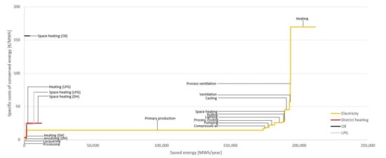 Table 2. It is thus difficult to say how many EEMs are needed in order to calculate a specific cost of conserved energy with a high degree of reliability. However, it is more likely that the costs of conserved energy and mitigated GHG emissions will be more reliable for processes where a larger number (16–22) of EEMs has been studied, e.g., lighting, heating or space heating, than for processes with fewer EEMs, e.g., processing and lacquering.