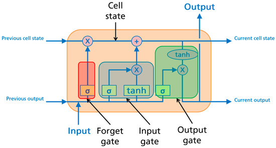 where the hyperbolic tangent function () activation function is denoted by tanh, while and denote the weights and bias of the current gate. The output of an LSTM layer is calculated by the following equation: