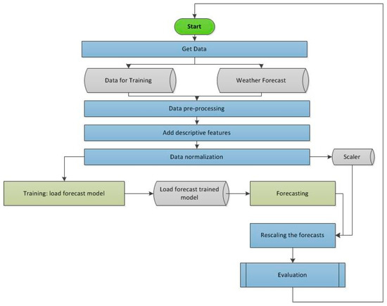 The concept of the developed load-forecast follows the idea of a constant data flow. The forecast algorithm should respond to changed behavior and provide updated, in-time load-forecasts, including the latest available measurements of the building. The methodology is shown in Figure 4 and described in the following sections. As datasets of varying length were used, an overview is given in Appendix A.