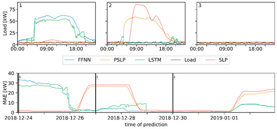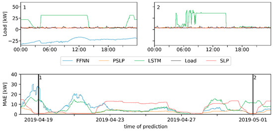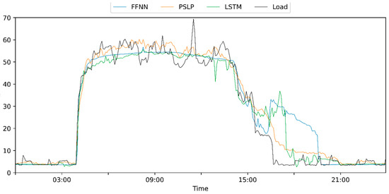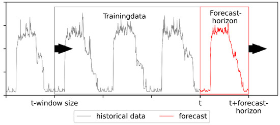 The training process (Figure 4) is limited to the length of the input data, or rather, the load measurements of the previous two months. The compiling of the neural networks is done once at the beginning of the sliding window forecast approach and then fitted to the given data. Afterwards, the neural networks always become refitted but not compiled again. The refitting process of the PSLP was performed every 24 h at 12 p.m. and, in contrast to the neural networks, implemented with all available data up to the current simulation time step.