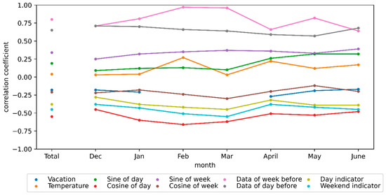 In Equation (8), and are the features and and as the means of the features. describes the standard deviation of the respective features. To develop an in-depth understanding of the correlations, the data is evaluated once using the full dataset and one time using a monthly separated dataset, to find possible seasonal or calendrical relationships.