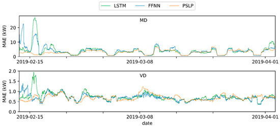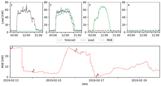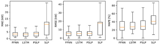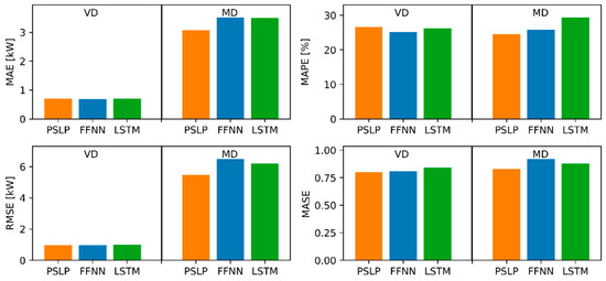In the formulas, is the predicted value and the measured one to a specific time step and number of time steps in the forecast horizon . Whereas MAE, MAPE and RMSE are used in many studies (e.g., [11,12]), the MASE (Mean Absolute Scaled Error) is not often used and is further described in [13]. This metric differs from the other methods, as it is independent of the scale of the data. It compares the MAE reached by the tested method to a naive prediction that is, in this study, the seven-day previously measured power value (. With a value of the MASE below 1, the method performance used is better than the naïve forecast.