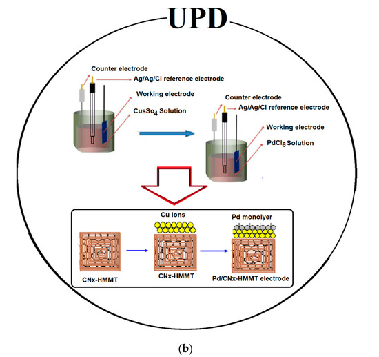 In the second step, the Pd layer was electrodeposited on CNx-HMMT using a technique similar to surface limited redox replacement (SLRR) for monolayer formation (Figure 1b). A Pine WaveNowXV potentiostat was utilized to carry out all electrochemical experiments. In the deposition process, the three-electrode cells were used. The first cell was filled with 10 mM CuSO4, the second cell contained 50 mM H2SO4 solution, and the third cell was filled with 0.05 PdCl2. The Pt wire was utilized as a counter electrode, while Ag/AgCl was used as a reference electrode. All the potentials values mentioned in the paper are intended to be referred to the Ag/AgCl scale. The CNx-HMMT composite was used as working electrode and was set up in hanging meniscus in three-electrode cell. All three solutions were purged with N2 gas for at least 15 min before starting the deposition process. The working electrode was immersed in H2SO4 solution in order to remove impurities. Initially, the working electrode was deposited by a few atoms of Cu via bulk Cu deposition in the 10 mM CuSO4 cell. This bulk deposition was necessary as UPD does not occur at the beginning of the reaction. The working electrode was then immersed into the third cell where Cu was galvanically replaced by Pd under the open circuit potential (OCP). Once the monolayer of Pd was prepared, the UPD among Cu and Pd was carried out in controlled manner. Finally, the prepared Pd/CNx-HMMT electrode was washed with double distilled water before conducting other electrochemical measurements.
