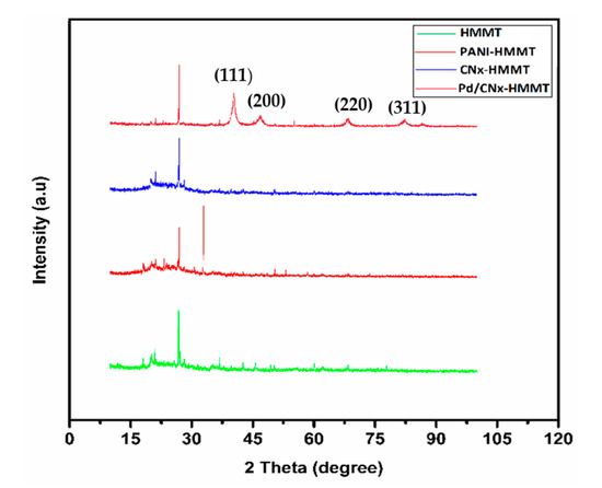 Figure 3 shows the XRD pattern of HMMT, CNx-HMMT and Pd/CNx-HMMT. From the XRD pattern of HMMT, the prominent quartz peaks appear at 2θ = 20.1° and 26.8°. In addition to that, other weak reflections were also observed that indicated the acid treatment dissolves octahedral cations (Al3+, Mg2+, and Fe3+) of MMT crystal structure which resulted in the destruction of MMT octahedral crystal structure and the subsequent strengthening of quartz diffraction peak [42,43]. The in-situ polymerization of aniline resulted in the formation PANI–HMMT composite which lowered the intensities of HMMT peaks, although peaks become less intense but still present that exhibited the preservation of basic clay framework even after the development of composite structure. This also confirmed the uniform distribution of HMMT on polymer matrix.