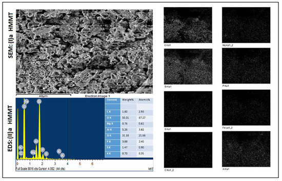 It was seen that the acid-treated HMMT have an irregular morphology with very rough surfaces. From Figure 4Ib the separated HMMT block or flakes were seen under the coverage of polyaniline (PANI) and very rough surface morphology was observed. These findings reinforced the successful preparation of PANI–HMMT composite and showed good compatibility among the two constituents [47]. Moreover, it is also a proof of homogenous distribution of both HMMT and PANI over each other [48].