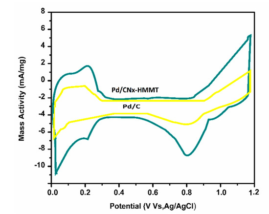 The electrochemical measurements were performed using a typical three-electrode cell at room temperature [34,38]. The electrochemical measurements of all prepared samples were carried out using a Pine WaveNowXV potentiostat, commercial 20 wt % Pd/C supplied by E-TEK, Co. was also tested as reference material [39]. In a typical procedure, catalyst ink was synthesized by adding 5 mg of prepared electrocatalysts in 1 mL of Nafion/ethanol (0.25% Nafion) mixture. Approximately 8 to 10 µL of the dispersion was moved onto the glassy carbon disc using a pipette and then allowed to dry completely at ambient conditions. The resultant catalyst loading was 0.455 mg cm−2. The mass percentage (20 wt %) of Pd in the Pd/C and Pd/CNx-HMMT catalysts as well as the Pd particle size (4–5 nm) are the same in the two materials. A conventional three-electrode system was adopted, in which MMT-CNx modified glassy carbon electrode (5 mm in diameter) as the working electrode while Pt wire, and Ag/AgCl were used as the counter electrode, and reference electrode respectively. The CVs of Pd/C and Pd/CNx-HMMT were carried out in N2 saturated solution of 0.5 mol L−1 H2SO4 and 0.5 mol L−1 MeOH at a scan rate of 20 mV/s at ambient temperature. All the CV experiments were performed at room temperature and in an O2-free atmosphere by bubbling the electrolyte with high purity N2 for 30 min.